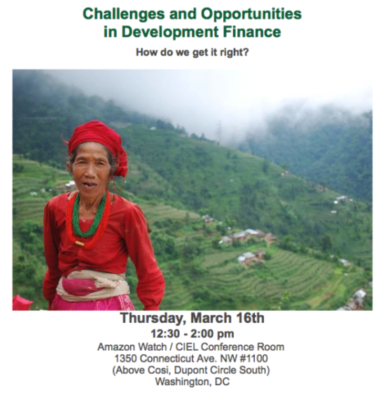 Accountability Counsel’s Policy Director, Kindra Mohr, led a discussion with partners from the Bank Information Center (BIC), the Center for International Environmental Law (CIEL), the Coalition for Human Rights in Development, and the International Accountability Project (IAP) for the Amazon Watch lunch event on “Challenges and Opportunities in Development Finance.”… -