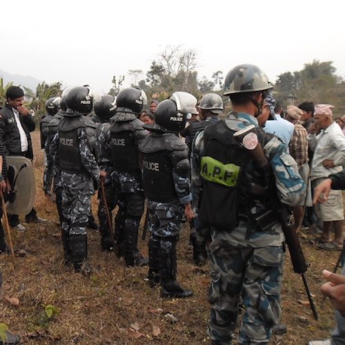 In early April 2016, the Government of Nepal deployed armed police forces to Sindhuli District to ensure opposition to the project did not obstruct surveying and construction activities. In April 2016 and, later, in July 2016, the police beat and detained community members who were peacefully opposing the project. Both times, community members were released from prison only after agreeing under duress to sign their “consent” to the project.